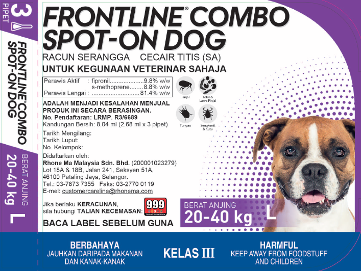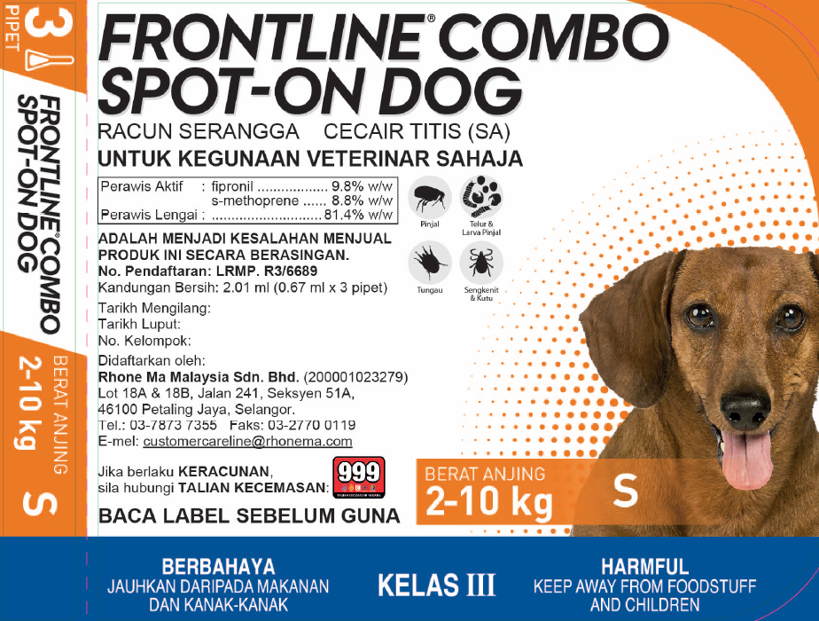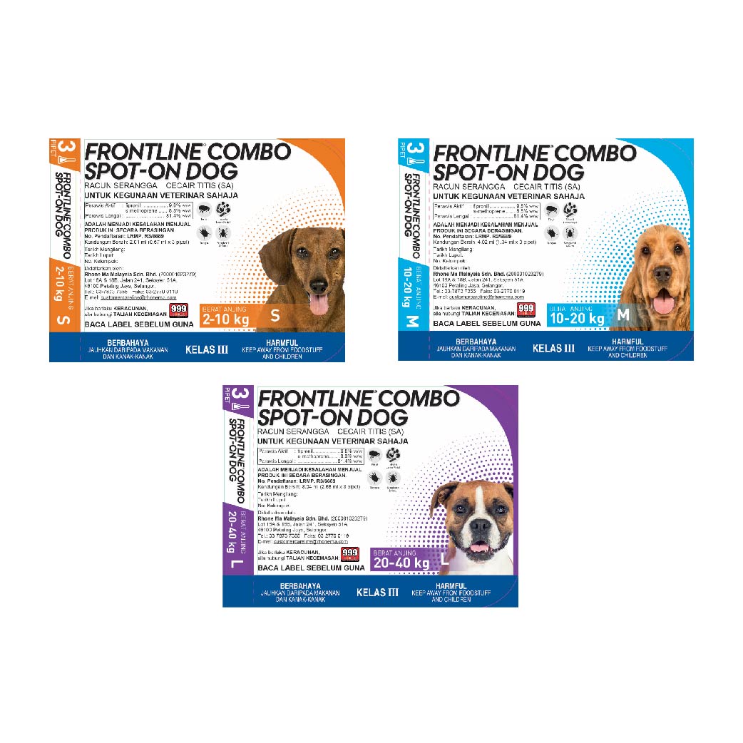 Frontline® COMBO Spot On Dog is a combination of phenylpyrazole and s-methoprene insecticides and effectively kills all stages of ticks, lice, fleas and mite life cycle (adult, eggs, and larvae), controlling infestation and re-infestation thus flea allergy dermatitis is alleviated.